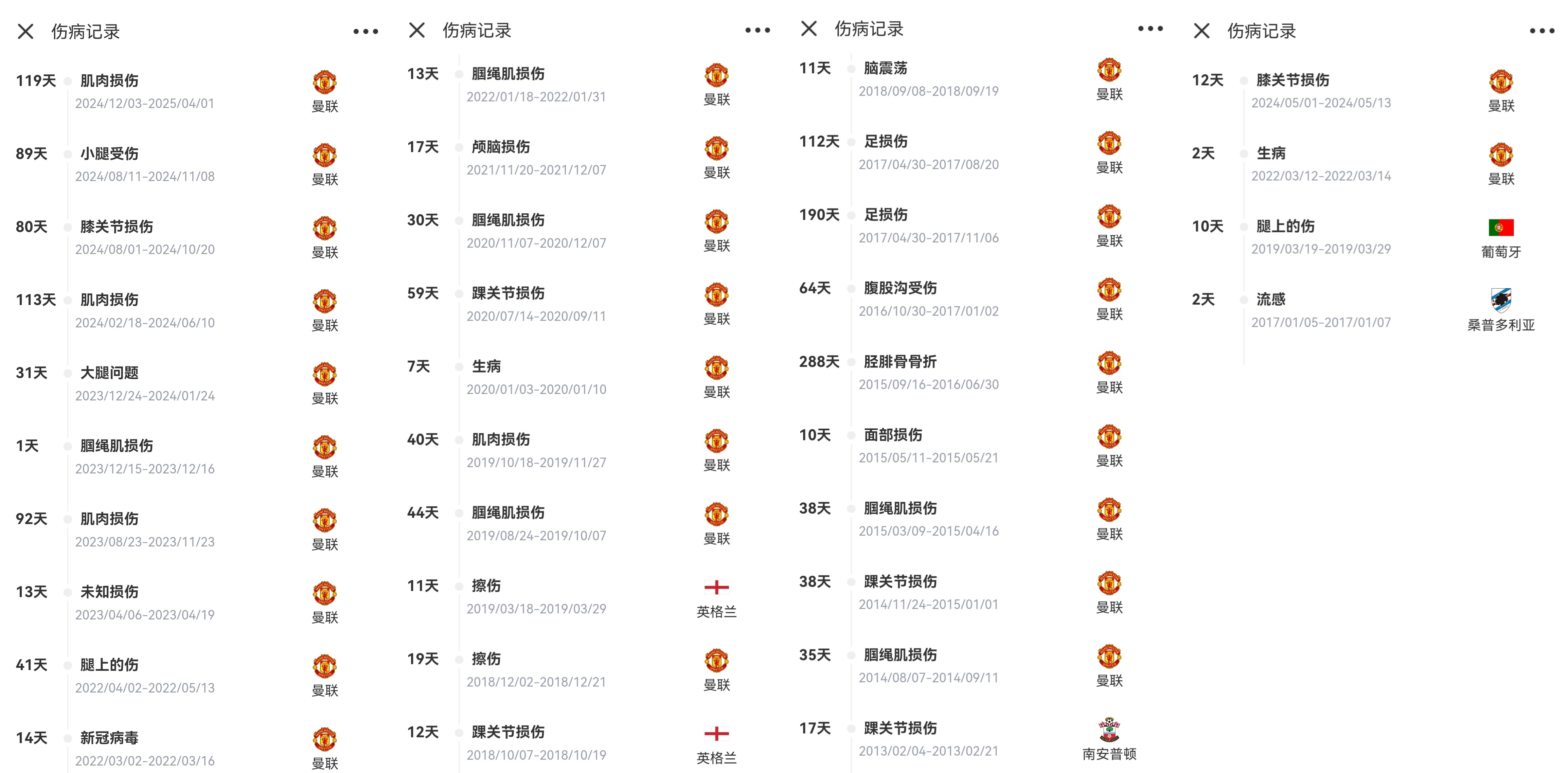 以下为卢克肖和B费生涯因伤缺阵的情况,左边三页是卢克肖的,右边一页是B费的。