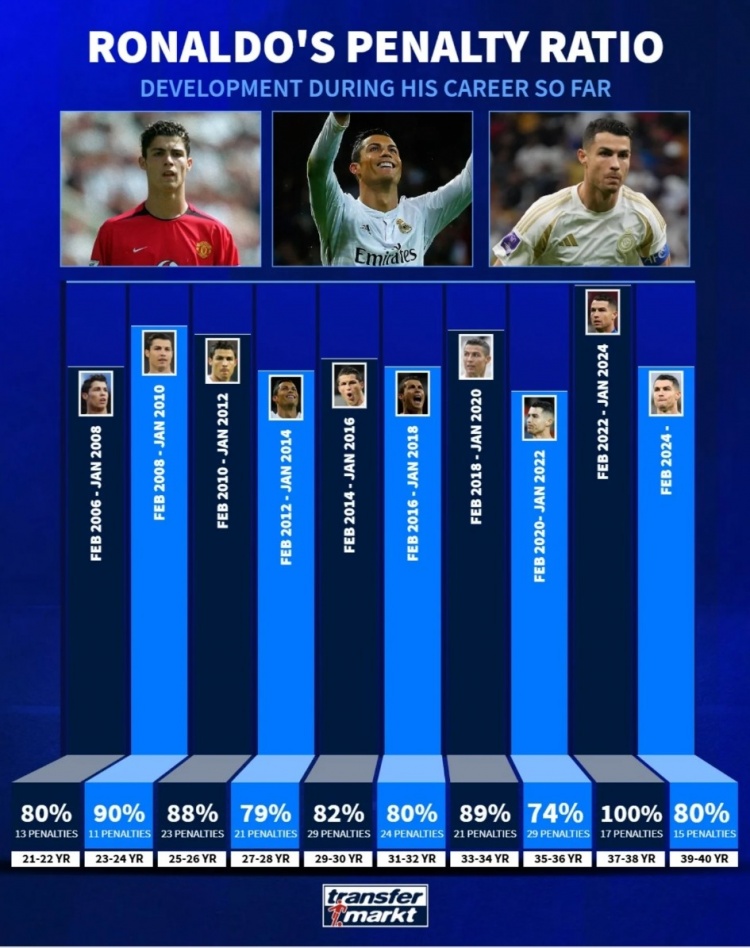 C罗职业生涯点球命中率:37到38岁100%最高,39到40岁80%