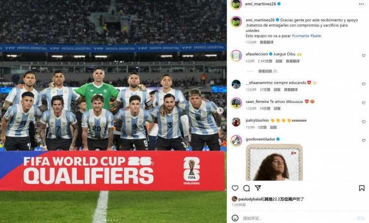 阿根廷门将马丁内斯也在社媒晒出本场球队首发合影,配文写道:“感谢大家的热情支持,我们在场上努力付出一切,这支球队永不会停下脚步!”