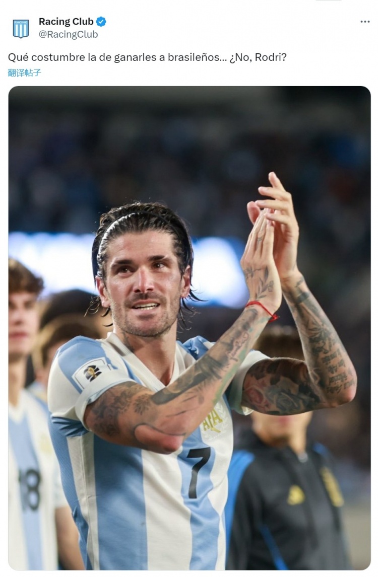 阿根廷竞技俱乐部社媒晒出自家青训国脚德保罗的照片,并写道:“击败巴西人真是成习惯了,对吧,德保罗?”
